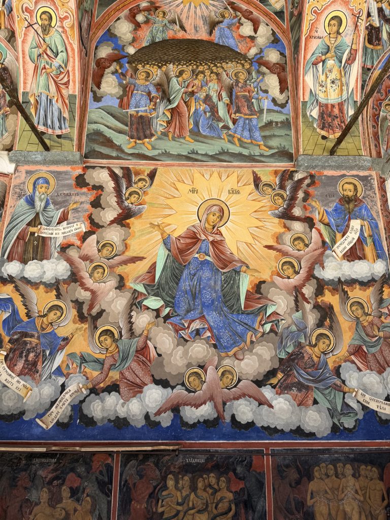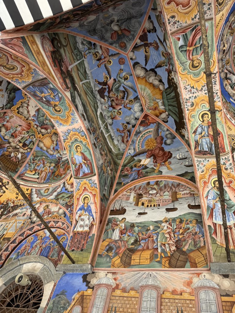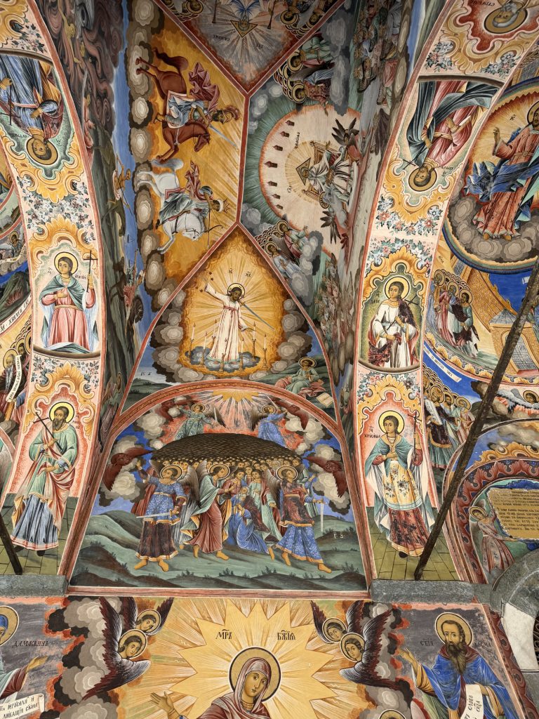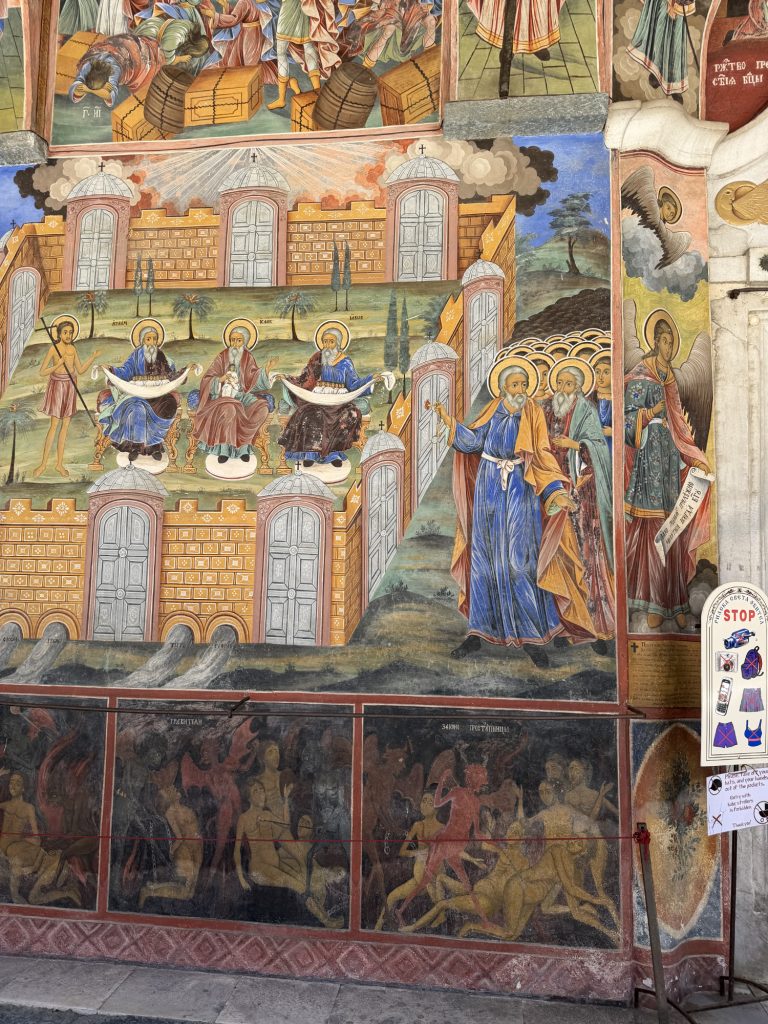Now, I have heard it said that the insides of Orthodox churches are effectively graphic novels of the life of Christ. In this case, these photos are all of the exterior of the church at the center of the complex. The fresco’s are amazing, and you get not only the life of Christ, but also a bit of the Old Testament precursor stories. You can spend an hour or two just looking at these details.