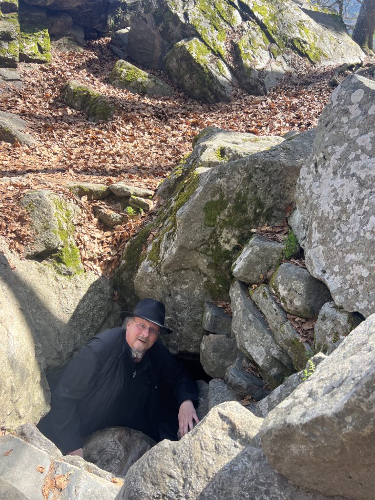 For me, the problem wasn’t my gut, but my shoulders. The only way to get out was to put one arm and shoulder out, while reaching for my toes with the other arm. Once I got far enough, a partial roll and a twist let me work the other shoulder then arm out. The photo earlier was taken just after I had gotten my feet under me. And, yes, I did wear my fedora through the cave along with my Scott-E-Vest. And, yes, you also have to do some ducking, twisting, and almost crawling getting in as well.